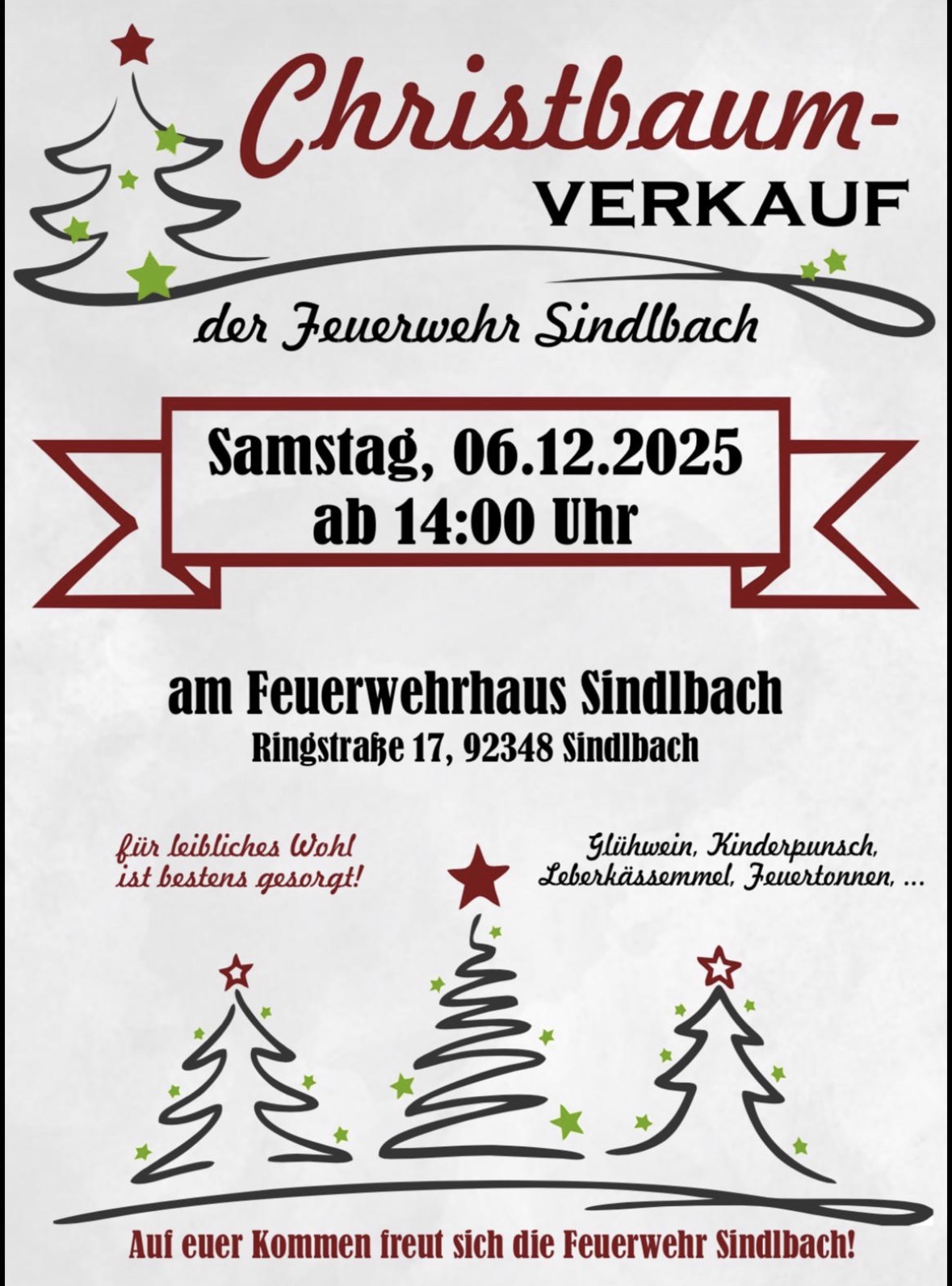 Die Feuerwehr Sindlbach und die SRK Sindlbach laden die Bevölkerung herzlich zur Chrisbaumversteigerung am 28.12.2024 um 19 Uhr in Gebertshof ein.
